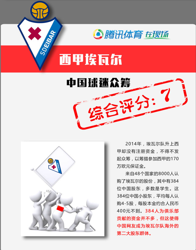 时下中国资本在欧陆足坛的扩张已成大势,但这其中有一个特例,就是西甲埃瓦尔队。2014年,埃瓦尔队升上西甲却没有注册资金,不得不发起众筹,以筹措参加西甲的170万欧元保证金。来自48个国家的8000人认购了埃瓦尔的股份,其中有384位中国股东,多数是学生,这使得中国网友成为埃瓦尔队海外的第二大股东群体。