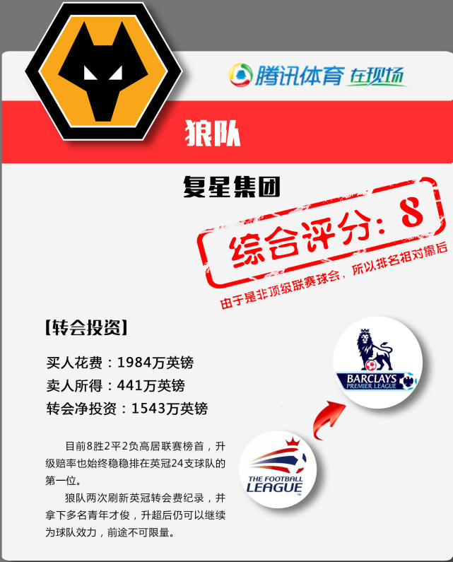 今年夏天狼队继续走葡萄牙路线以1611万英镑从波尔图签下中场超新星内维斯,再度打破英冠纪录,而且聘任前波尔图少帅桑托执掌球队。目前狼队在英冠8胜2平2负高居联赛榜首,各大赔率网站狼队的升级赔率也始终稳稳排在英冠24支球队的第一位。