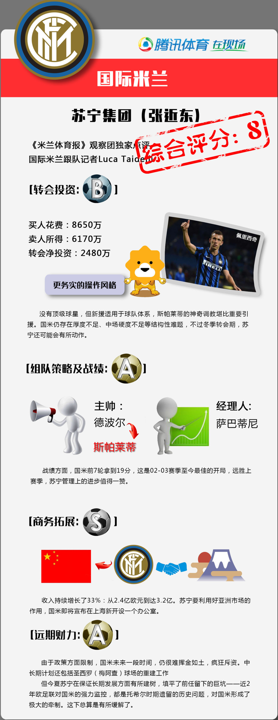 商务扩展:7分 虽然国米的成绩还有待提高,但收入持续增长了33%:从2.4亿欧元到达3.2亿。苏宁要利用好亚洲市场的作用,国米即将宣布在上海新开设一个办公室,最近国米媒体之家也宣布揭幕,另外他们还在寻求为青年队建立一个体育中心,让一线队和青年队都可以纳入其中。