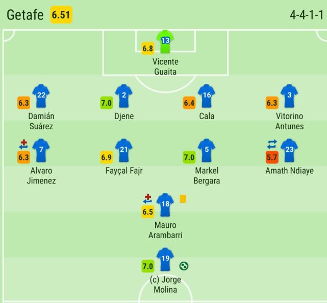 赫塔费首发:13-瓜伊塔、22-达米安-苏亚雷斯、2-达科纳姆、16-胡安-卡拉、3-安图内斯、18-阿兰巴里、5-贝尔加拉、7-阿尔瓦罗-希门尼斯(14'12-波尔蒂略)、23-阿马特-恩迪亚耶(66'8-拉岑)、21-费萨尔-法伊尔、19-莫利纳