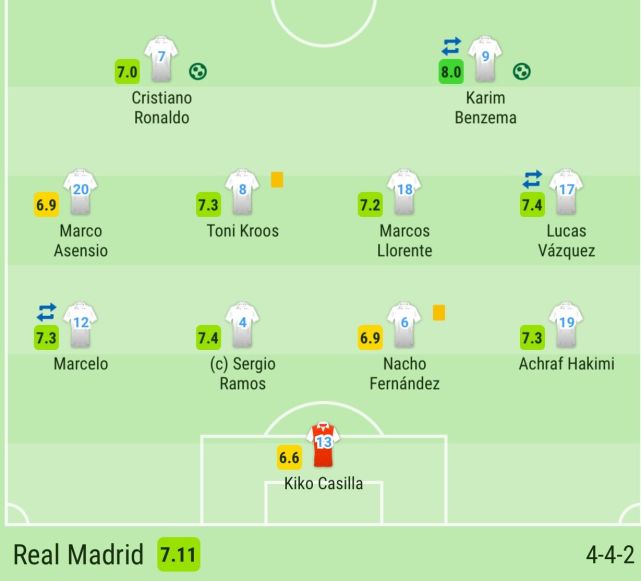 皇家马德里首发:13-卡西利亚、19-阿奇拉夫、6-纳乔、4-拉莫斯、12-马塞洛(72'15-特奥-埃尔南德斯)、17-巴斯克斯(72'22-伊斯科)、18-马科斯-略伦特、8-克罗斯、20-阿森西奥、9-本泽马(81'21-马约拉尔)、7-C-罗纳尔多