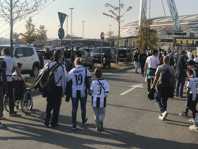腾讯体育当地时间10月15日讯(特约记者小帆发自都灵安联球场),十月的都灵抓住了夏天的尾巴,温暖的几乎像回到了夏天。尤文与拉齐奥的比赛被安排在了当时时间下午六点,赛前安联球场外有一种标志性的“意大利下午”感觉,温暖的阳光、欢快的孩童还有结对来看球的情侣,尤文的比赛成了当地其乐融融的家庭周末活动,得益于尤文城的建设,当地球迷可以早早的来到球场附近,吃一顿午饭、逛一逛商场,午后一家人聚在安联球场的广场上晒太阳。迪巴拉是意大利小朋友中最受喜爱的球员,球场周围随处可以听到稚嫩的小奶音发出的”迪!巴!拉!”。尤文的球迷也已经接受了这位新“10号”,他的球衣在球场外随处可见。跟场外气氛相似的是尤文拉齐奥两家俱乐部球迷的关系,笔者在场外碰到的一位拉齐奥球迷就表示作客安联球场,拉齐奥没有什么好输的,并且祝福尤文在欧冠赛场上能取得好成绩。