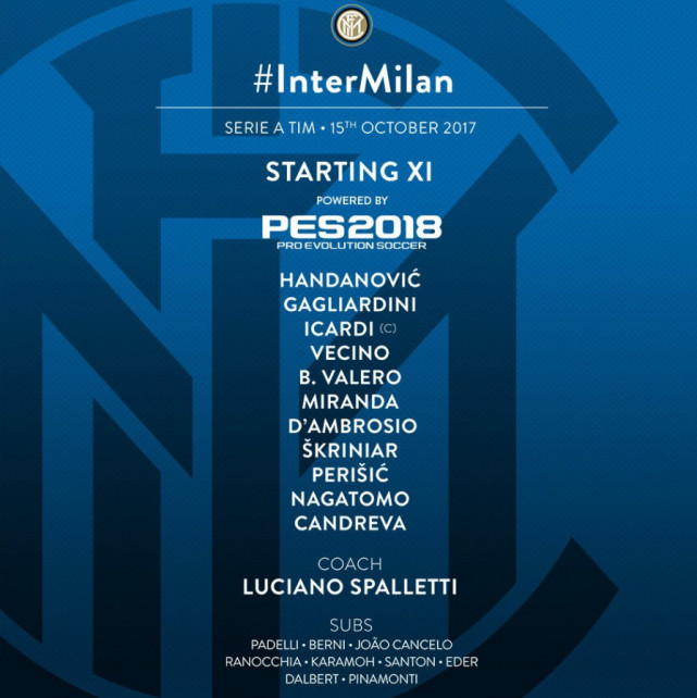 国际米兰(4-2-3-1):1-汉达诺维奇/33-丹布罗西奥、37-什克里尼亚尔、25-米兰达、55-长友佑都/11-贝西诺、5-加利亚尔迪尼/87-坎德雷瓦、20-博尔哈-巴莱罗、44-佩里西奇/9-伊卡尔迪