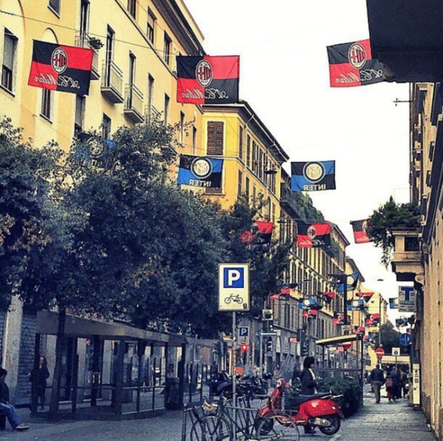 开赛前一周,有人托我拍摄市区内的德比氛围,我为之一笑,心想这么早哪有氛围可言,不料没过两天就遭打脸:米兰著名的华人街挂上了两支球队的旗帜,一根细绳系两边,两队队旗挂中间。由于华人街靠近市中心繁华地段,鲜明的旗帜形成了一道靓丽的风景线,仿佛提醒着人们一个重大的节日即将到来。一时间华人街成了足球人的热门景点,足球记者们自不在话下,就连AC米兰官方账号以及国际米兰的张康阳也纷纷转发晒图。