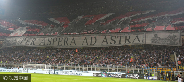 提到德比,自然少不了球迷的Tifo,虽然是国米的主场,但米兰也不甘示弱:骑士们在红黑彩带中登场,下面标语用拉丁文写着:寻此苦旅,以达天际。而国米这边则是简单的“为北看台进球吧”,不得不说,国米的北看台此役输了一阵。