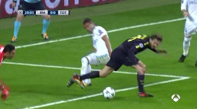 争议出现在第20分钟,面对奥里耶的左路横传,纳瓦斯扑球脱手,略伦特回身断球但却被回放的卡塞米罗一脚铲倒,近在咫尺的凯恩举手示意对手犯规,但主裁判却并未判罚点球,这引发了热刺球员的不满。慢镜头显示,卡塞米罗回防时连球带人一起铲,的确有犯规的嫌疑。