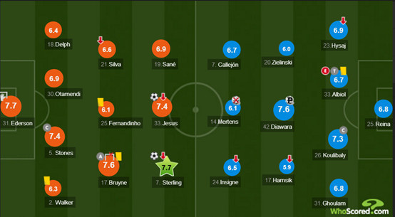 只差1球,瓜迪奥拉紧张起来。第76分钟,头部受伤的席尔瓦被京多安换下,加上之前替补斯特林登场的贝尔纳多-席尔瓦,意在加强控球以缓解压力。萨里则用左边锋乌纳斯换下哈姆西克,继续加强进攻。第80分钟,又是阿兰后场断球后送出直塞,遗憾的是默滕斯仓促起脚打偏。第87分钟,瓜帅罕见的用达尼洛换下中锋热苏斯,达尼洛可边可中,任务就是加强防守。最终,曼城守住胜果,在主场如愿以偿的2-1击败那不勒斯。