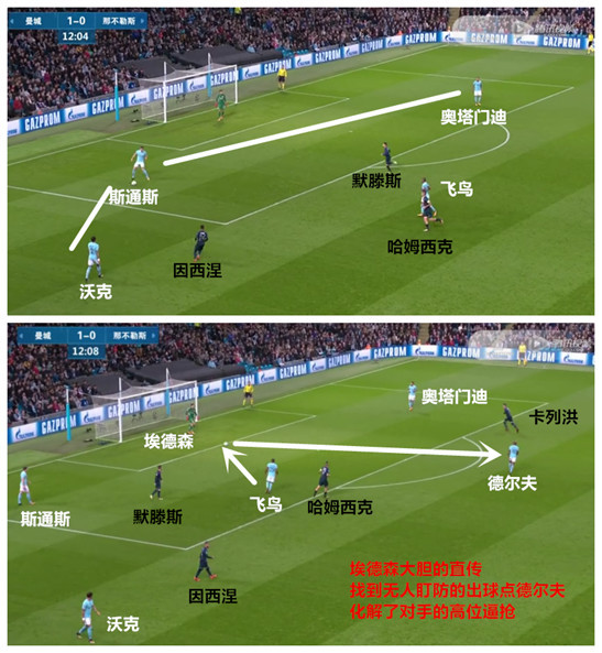 曼城的第2个进球,就是成功化解了对方的逼抢。德尔夫接到埃德森的直传后发动进攻,斯特林的传中造成阿尔比奥尔解围失误,德布劳内得球后送出手术刀般精准传中,助攻热苏斯破门得分。