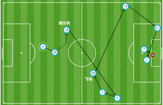 一旦对手逼得不够紧,出现松懈,曼城随时随地都能发起进攻。第1个进球,就是迪亚瓦拉直传找默滕斯被断,除哈姆西克外其他球员还没来得及上抢。此时,德尔夫和飞鸟都站在中路的好处就体现出来:两人的本职工作都是后腰,具备分球的视野和传球的脚法。先是德尔夫一脚长传转移精准找到右路的斯特林,经沃克传球过渡后,轮到飞鸟将球转移到左路的萨内。