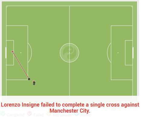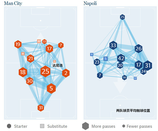 在曼城的高压逼迫下,那不勒斯的中后场很难与哈姆西克以及前场三叉戟形成有效联系。而当回到本方半场防守时,曼城仍是4后卫站位。速度快的沃克负责盯防因西涅,因西涅擅长内切,但蓝月中路防守人员密集,他很难施展拳脚,竟然没有完成1次准备传中,也没有送出1次关键传球,要知道本赛季在意甲,他场均关键传球3.3次,队内第一。而身高只有171厘米的默滕斯陷入斯通斯和奥塔门迪的夹防中,缺少活动空间,无法发挥他灵活快速,技术出色的特点。
