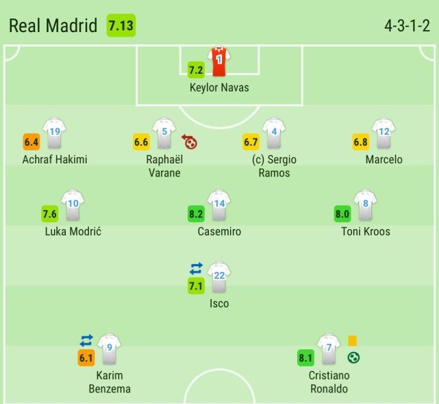 皇家马德里首发:1-纳瓦斯、12-马塞洛、4-拉莫斯、5-瓦拉内、19-阿奇拉夫、10-莫德里奇、14-卡塞米罗、8-克罗斯、22-伊斯科(87'17-巴斯克斯)、7-C罗、9-本泽马(76'20-阿森西奥)