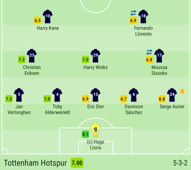 托特纳姆热刺首发:1-洛里、5-维尔通亨、4-阿尔德韦雷尔德、15-戴尔、6-达文森-桑切斯、24-奥里耶、23-埃里克森、29-温克斯、17-穆萨-西索科(89'7-孙兴慜)、18-费尔南多-略伦特(80'3-丹尼-罗斯)、10-哈里-凯恩