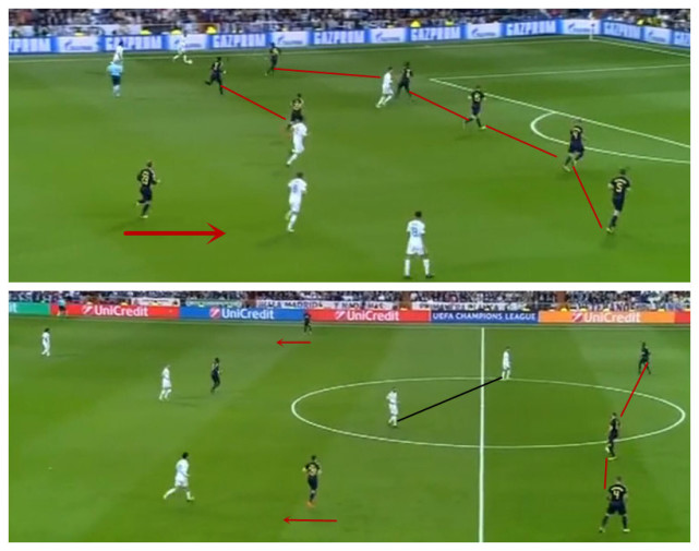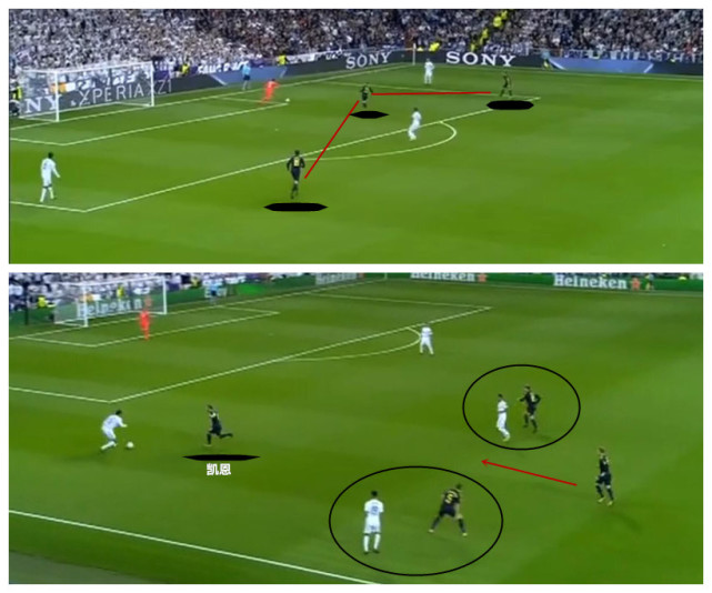 本场比赛波切蒂诺用同样招数对待皇马,如图可以清晰看见在皇马半场以凯恩为首有多名热刺球员在高位进行骚扰,皇马出球点被限制的很死,很难从容的展开进攻,只能盲目的开大脚丢失球权。而热刺由守转攻的速度非常快,在皇马回位不及时之际很容易被打透。
