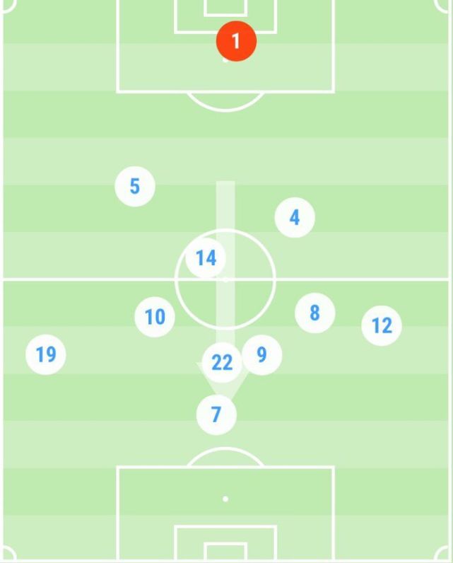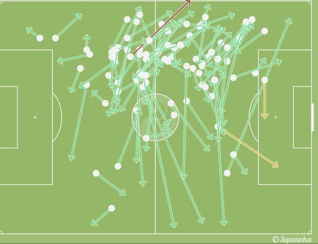图为克罗斯本场的传球线路。他虽然贡献了很高的传球成功率,但缺少真正有威胁的向前传球。在与西索科这种身体流派球员的较量中更展现了自己对抗的不足,在马塞洛缺少突破的前提下,克罗斯没办法像科瓦契奇一样能通过连续的盘带和突然的变速推进能力展开进攻,所以皇马过往强势的左路进攻难以有效开展。