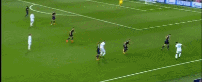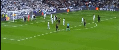 在此条件之下,莫德里奇慢慢靠向左路提供支援,与伊斯科-克罗斯等人在肋部形成了渗透配合,本泽马的穿插跑位为克罗斯的插上射门提供了支持,奥里耶只能犯规送点。