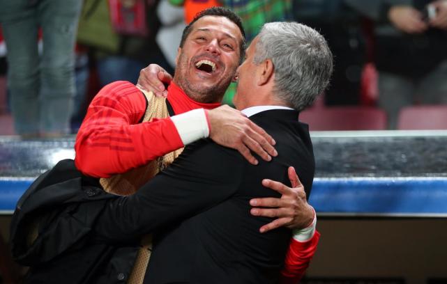 带着25冠,穆里尼奥回到祖国,对阵老东家。而有意思的是,他在这里还碰到了执教国米时的主力门将儒利奥-塞萨尔。塞萨尔如今在本菲卡效力,两人热情的大笑拥抱,让人忍不住追忆起蓝黑军团的那段三冠王辉煌岁月。