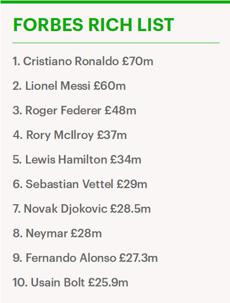 在这份福布斯体坛财富榜上,排在第二的是C罗一生之敌梅西,巴萨球星年入6000万镑。不过,前10中除了C罗和梅西和第8的内马尔(2800万)外,其他人都是非足坛运动员,包括第3的费德勒(网球)、第4的麦克罗伊(高尔夫球)、第5的汉密尔顿(赛车)、第6的维特尔(赛车)、第7的德约科维奇(网球)、第9的阿隆索(赛车)和第10的博尔特(田径)。