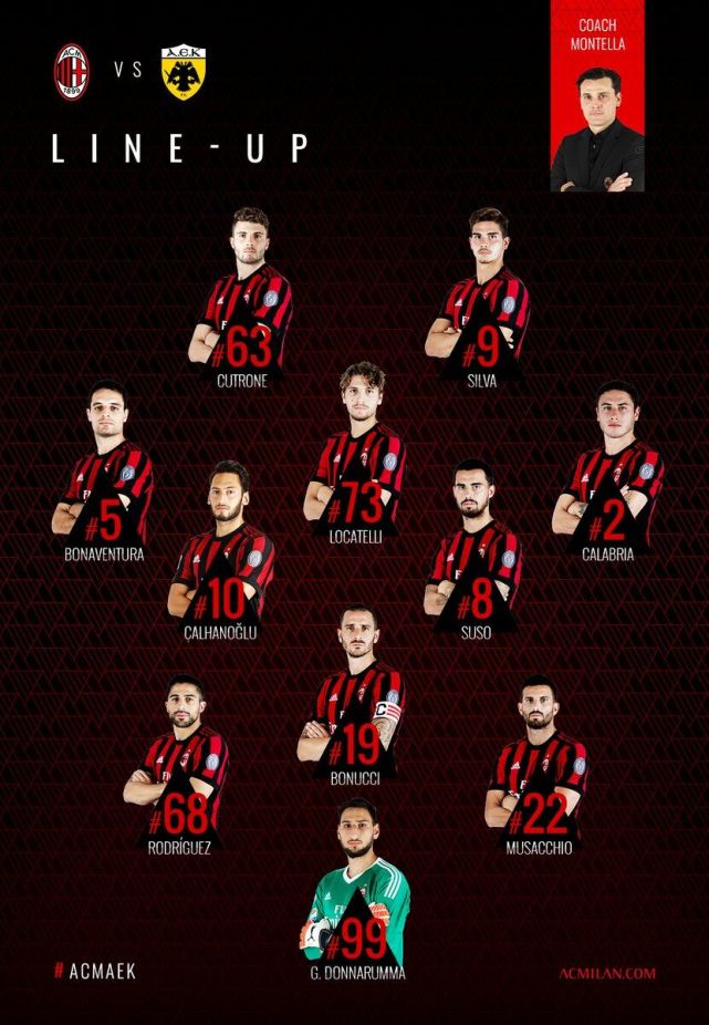腾讯体育10月20日讯 北京时间凌晨3时5分,欧联杯D组小组赛第三轮一场焦点战,AC米兰坐镇主场对阵雅典AEK队。赛前双方首发阵容已公布。AC米兰方面,罗马尼奥利因伤缺席,萨帕塔、古斯塔沃-戈麦斯因为技术原因缺席,红黑军调整首发阵容,穆萨基奥、博努奇、罗德里格斯、卡拉布里亚四名后卫出场。虽然欧足联官方认定AC米兰仍旧排出352阵型,只是罗德里格斯客串中卫,但具体站位有待解读。安德烈-席尔瓦和库特罗内组成锋线,卡利尼奇伤愈但只是替补,比格利亚、凯西出任替补,洛卡特里等人轮换出场。