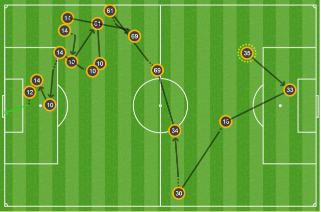 谁也没想到在沉闷了80多分钟后,阿森纳竟然在最后时刻奉献上如此精彩绝伦的进球。整个进球过程中,除了右中卫德布希之外,场上10名枪手球员都有触球,共完成15脚不间断传球,从后场发起进攻到禁区内倒钩破门,用时只有37秒。