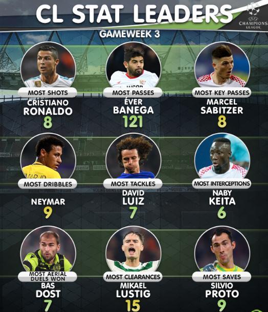 内马尔球风华丽,在比赛中的过人非常多,而在本轮的欧冠联赛中,他又有九次成功的过人,成为了本轮欧冠的过人王。而在本赛季的欧冠联赛,他场均7.3次过人也位居首位。切尔西后卫大卫-路易斯在对战罗马的比赛中发挥高光,一共有过七次的铲断,他也是本轮欧冠的铲断王。莱比锡红牛队的红场凯塔在本轮欧冠有六次断球,是欧冠的断球王。