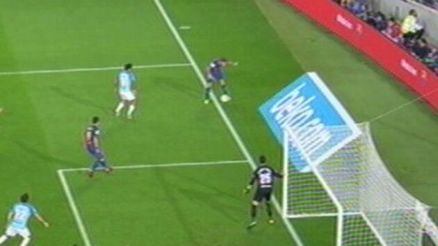 然而,此役仅仅开始了113秒,巴萨就攻破了马拉加球门。迪涅左侧底线横传,德乌罗费乌轻松推射入网。然而,就在德乌罗费乌破门之后,马拉加球员就集体举手示意,看到主裁判判罚进球有效,马拉加球员更是集体申辩,场边的马拉加主帅米歇尔也一脸茫然的看向了大屏幕。转播镜头准确的拍到了马拉加球员为何如此不满,慢镜头显示,迪涅左路横传打在贝斯身上反弹,迪涅紧跟上左脚再次横传,但就在巴萨左闸横传前,皮球已经明显出界。