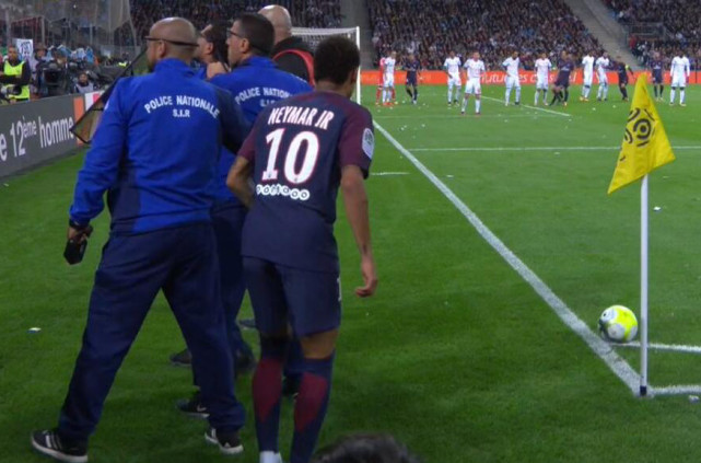 无力阻止马赛球迷们投掷杂物,现场安保人员只能拿出盾牌、雨伞试图挡住雨点一般落下的杂物。内马尔不停的从球场内拣出杂物,最后,无奈的巴西人只能在安保人员的催促下匆忙将球罚出。西班牙国家德比也曾出现过类似的场面,当菲戈以皇马球员的身份重返诺坎普时,巴萨球迷甚至扔下了一个猪头。