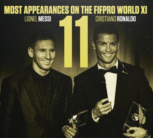 从那之后,梅西和C罗年年入选年度最佳阵容,从未落选,截止今年已经是第11次,两人也携手成为入选次数最多的球员。其次是伊涅斯塔的9次,拉莫斯的8次,以及阿尔维斯的7次。而这11年,也正是世界足坛的“绝代双骄”时代,尽管年度11人群星璀璨,但梅罗永远是最闪耀的那两颗星。