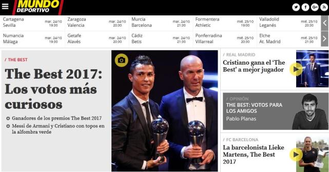 “C罗又一次成为世界最佳”,《阿斯报》强调,C罗得票率高达43.16%,远胜梅西的19.25%与内马尔的6.97%,C罗连续第二年获得这一荣誉。国际足联的颁奖典礼没有任何意外,C罗获奖,齐达内也拿下年度最佳教练头衔,并有5名皇马球员跻身年度最佳阵容,皇马再次统治了年度最佳颁奖礼。今年国际足联改革,首次以跨年度赛季作为评选最佳奖项的标准,上赛季C罗为皇马赢得欧冠、西甲、世俱杯与欧洲超级杯,他的优势无比巨大。