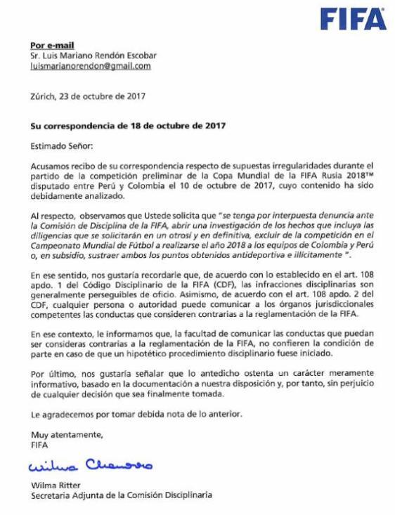 赛后,智利足协方面表示他们对秘鲁和哥伦比亚的比赛公平性提出质疑,他们不排除向国际足联起诉这两支国家队的可能性。今天国际足联官方正式回应了这一事件,国际足联表示他们收到了智利律师发来的起诉信。
