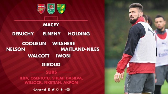 腾讯体育讯 北京时间10月25日凌晨2时45分(英国当地时间10月24日晚19时45分),2017-18赛季英格兰联赛杯1/8决赛,阿森纳坐镇酋长球场迎战诺维奇。腾讯体育将为您带来本场比赛的图文直播,赛前双方首发名单公布。