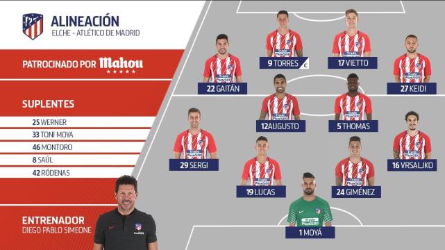 腾讯体育讯 北京时间10月26日凌晨3点30,2017-18赛季西班牙国王杯第4轮,马竞客场挑战埃尔切,双方首发阵容已经公布。