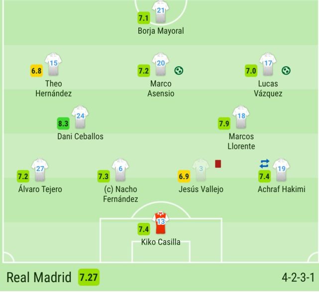 皇家马德里首发:13-卡西利亚、19-阿奇拉夫(81'29-费拉西耶)、3-巴列霍、6-纳乔、27-特赫罗、17-巴斯克斯、24-塞瓦略斯、18-马科斯-略伦特、15-特奥-埃尔南德斯、20-阿森西奥、21-马约拉尔