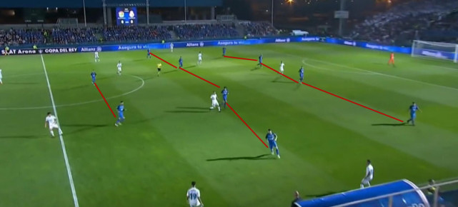 富恩拉布雷达的4-4-2阵型游动性很强,在阵地防守时全员回收到半场,并且有针对性的对皇马两个边路采取布防。虽然个人单防能力远远不够,但依靠防线的整体移动速度可以迅速在弱侧形成人数优势保证宽度和密度,皇马两个边路尽管有特奥、巴斯克斯这类突破型球员,但两个边后卫特赫罗以及阿什拉夫都缺少连续触球打配合的能力,强行的传中质量都不高。