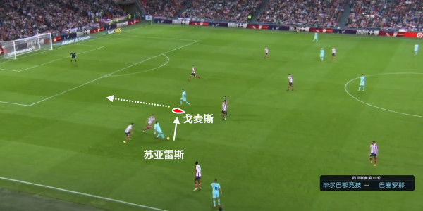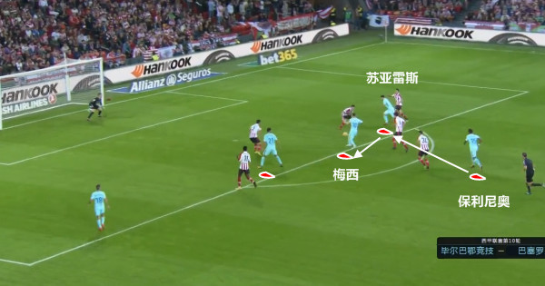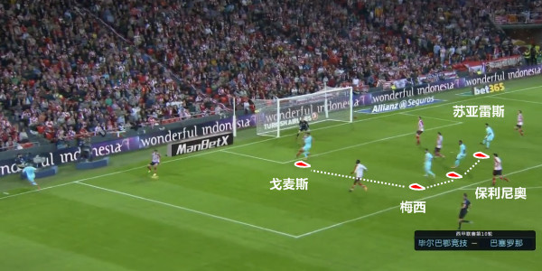 从战术板上可以看到,巴萨方面安排苏亚雷斯和梅西位置相对锋线球员来说是靠后一些的,与此同时戈麦斯和保利尼奥则获得了更多前插攻击的空间。这样的安排下,毕尔巴鄂竞技在盯人方面有一些顾此失彼,不自觉地就留出了一部分的空间。