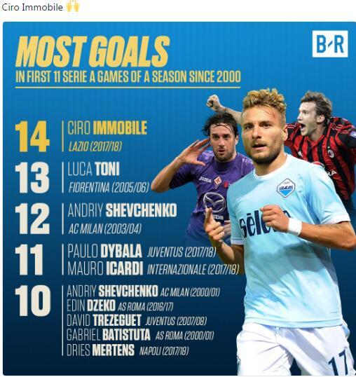 不仅如此,在因莫比莱身后的还有诸多的大神,比如2003-2004赛季意甲前11轮打入的米兰前锋舍甫琴科,2017-2018赛季前11轮比赛打入11球的迪巴拉以及伊卡尔迪。