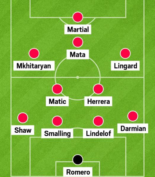中场方面,马蒂奇以及赫雷拉的主力位置不可动摇,毕竟博格巴、卡里克都有伤在身。而在攻击线上,卢卡库以及拉什福德会得到休息的机会,而马夏尔则会得到首发。除此之外,马塔、姆希塔良以及林加德会在马夏尔身后对其支援。