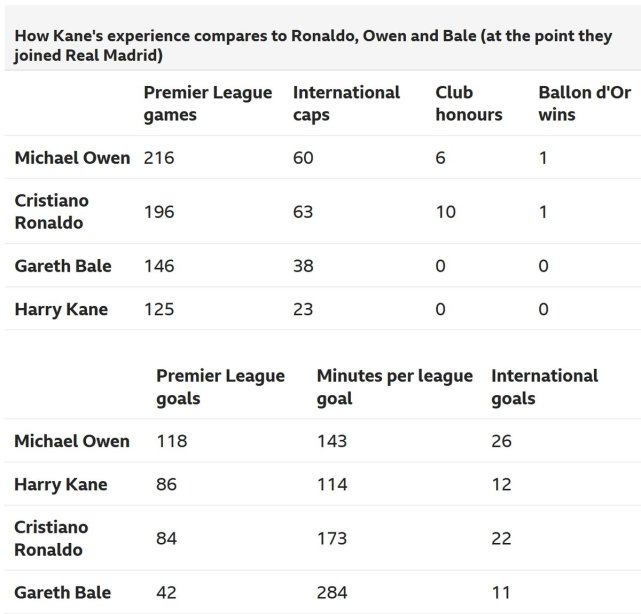 迈克尔-欧文、C罗和贝尔,三人都是在英超成名后加盟的皇马,而目前凯恩也受到了银河战舰的关注。那么如今的凯恩和当初的另外三大巨星差距如何呢?BBC用数据的方式进行了说明。在加盟皇马之前,欧文的英超出场次数是216次,他代表英格兰出场了60次,有6个冠军在手,还赢得了1次金球奖。在加盟皇马之前,C罗在英超出场了196次,代表葡萄牙出场了63次,有着10个冠军,还拿到1次金球奖。在加盟皇马之前,贝尔在英超出场了146次,代表威尔士出战38场,没有集体荣誉和个人荣誉,这和凯恩非常类似,热刺射手目前在英超出场了125次,代表英格兰出场23次,但是没有任何荣誉入账。