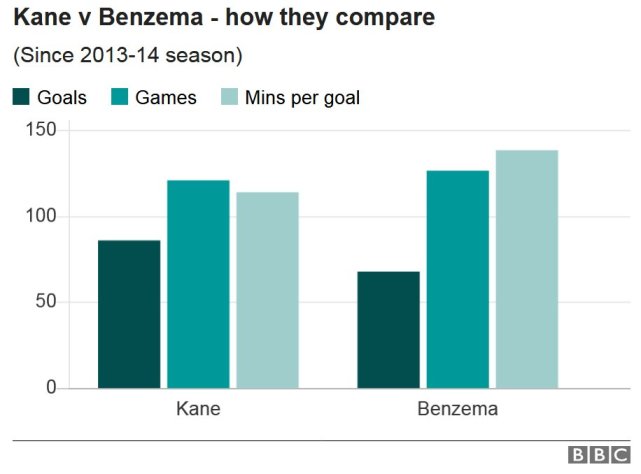 人们似乎更为关心凯恩和本泽马的对比,从2013-14赛季以来,凯恩在英超出场了121次,打入了86球,平均每114分钟一球。本泽马同期在西甲出场了126次,打入了68球,平均每138分钟可以打入一球。看得出来,凯恩的效率比法国人强不少。目前皇马和热刺在欧冠交锋之际,凯恩和本泽马也将过招,他们也将在球场的直接对话里分出一个高下。