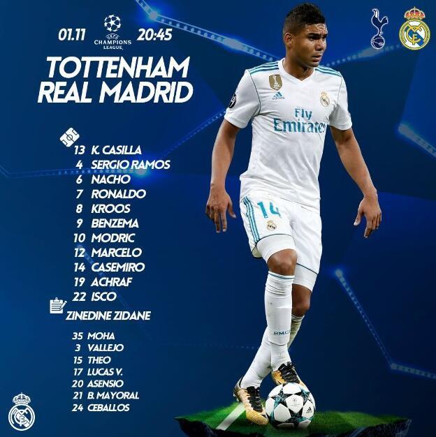 腾讯体育讯 北京时间11月2日凌晨3:45,欧冠第3轮小组赛中,皇马客场出战托特纳姆热刺。两队首发已公布,C罗搭档本泽马冲锋,伊斯科克罗斯莫德里奇坐镇中场,瓦拉内贝尔纳瓦斯缺席。热刺阵中,凯恩伤愈复出,埃里克森与阿里埋伏其身后: