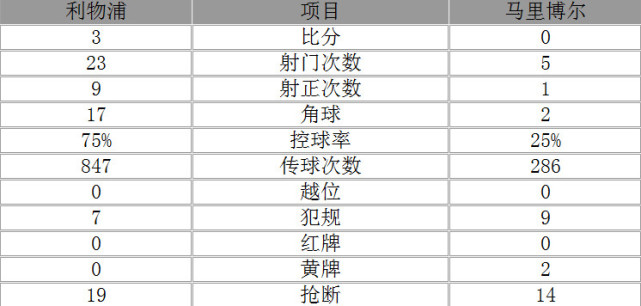 利物浦在主场全面占优,射门23比5,射正9比1,控球率高达75%,实力不济的马里博尔今天的表现比首回合出色,但他们仍然无法取得哪怕1个进球。