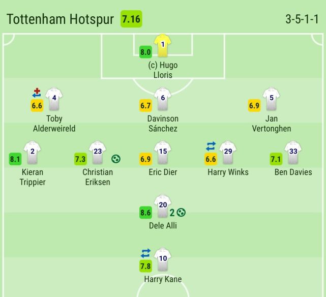 托特纳姆热刺首发:1-洛里、5-维尔通亨、6-达文森-桑切斯、4-阿尔德韦雷尔德(24'17-穆萨-西索科)、33-本-戴维斯、29-温克斯(66'19-登贝莱)、15-戴尔、2-特里皮尔、23-埃里克森、20-阿里、10-哈里-凯恩(79'18-略伦特)