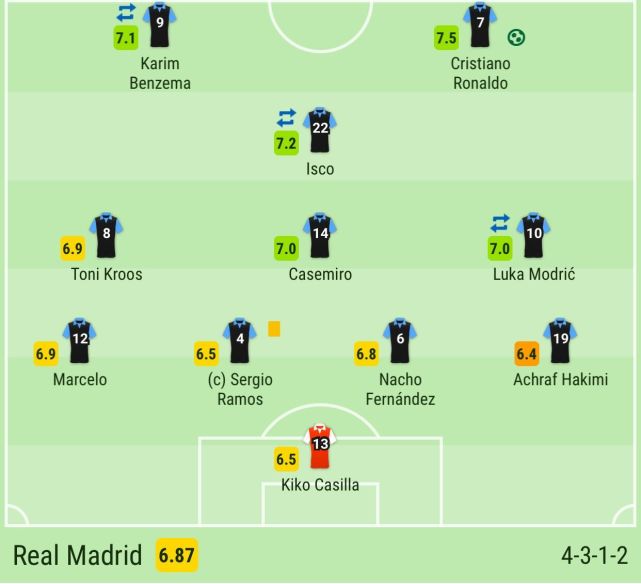 皇家马德里首发:13-卡西利亚、12-马塞洛、4-拉莫斯、6-纳乔、19-阿奇拉夫、10-莫德里奇(81'15-特奥-埃尔南德斯)、14-卡塞米罗、8-克罗斯、22-伊斯科(73'20-阿森西奥)、7-C罗、9-本泽马(73'21-马约拉尔)