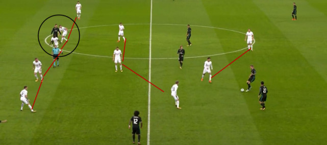 热刺和皇马本场都采取了高位逼抢,但方式和效果有所不同。皇马的逼抢除了双前锋外,经常是克罗斯/伊斯科轮番上前进行干扰,但两人爆发力都不足,光有对球路的预判远远不够。而热刺则是埃里克森-凯恩-阿里三人组成的前场逼抢小组,相比皇马运动能力更出色,逼抢也更凶狠、更有威胁。“从出球就开始限制皇马”,这点道理连西乙B的球队都知道了(富恩拉布雷达),但齐达内仍然忽略了这个细节,没有安排过多的接应点回撤协助,而是直接后场起脚潦草的找锋线球员,对球权的频频浪费后果是非常严重的。