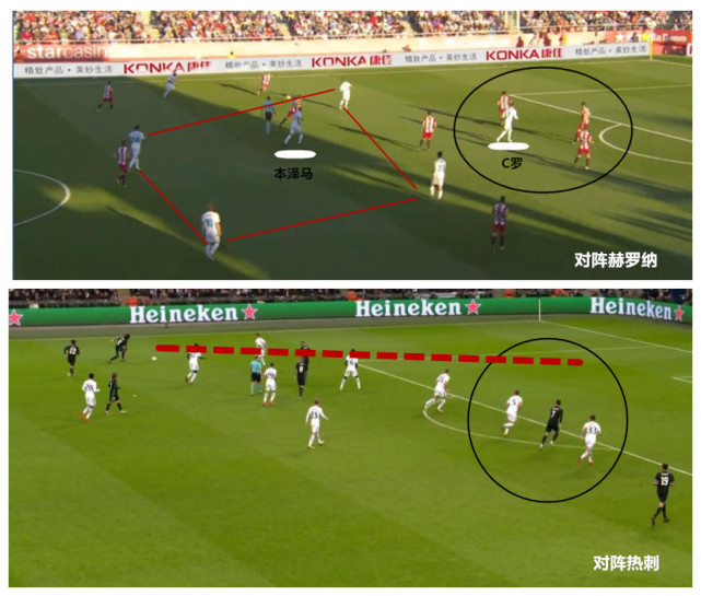 与赫罗纳、热刺的两场较量中,C罗都受到了对方三中卫的包夹干扰,根本没有射门空间。同时皇马整体也缺少依靠穿插跑位接应串联球队的进攻方式,单一的传中找C罗效果不佳。