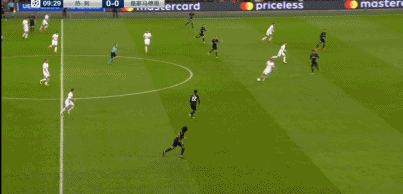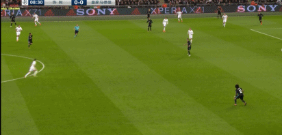 如图左路的马塞洛前插制造纵深,右路带球的伊斯科机敏的观察到了他的跑位并且一脚精准的长传直接交给了马塞洛,与此同时C罗的跑位也很精彩,先是稍停一下避免越位后开始加速抢点,但马塞洛错过了最佳传球时机。