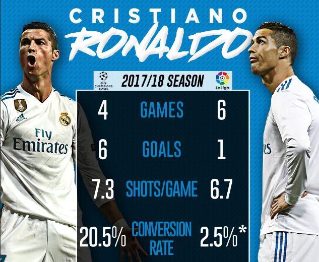 在新赛季,C罗在西甲与欧冠的进球两级分化也十分明显,在新赛季的西甲联赛中一共出战6次,打入1球,而在欧冠赛场四次出战,打入六个进球。不仅如此,从进攻效率看,C罗在欧冠赛场也更高。