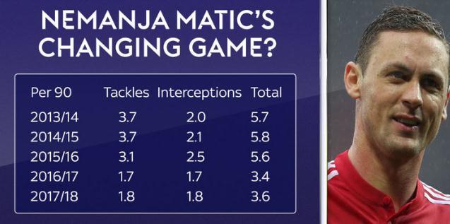 马蒂奇是切尔西夺得2014-2015赛季英超联赛的功臣,马蒂奇在中场防守凶狠,个人的铲断以及拦截能力十分强悍,同时还能助攻到前场,是一位典型的B2B球员。在2013-2016年的三个赛季中,马蒂奇每个赛季场均铲断次数与拦截次数分别为5.7次、5.8次以及5.6次。上个赛季,切尔西赢得了英超的冠军,马蒂奇与坎特的后腰组合功不可没,但是在数据上看,这与坎特的加盟有很大的关系,马蒂奇上个赛季的场均铲断以及拦截次数出现了明显的下滑,仅为3.4次。