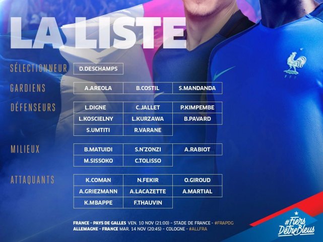 在11月份,法国队将进行两场国家队友谊赛,分别是11月10日对阵威尔士和11月14日对阵德国。在世界杯之前,这是德尚考察队员和磨合阵容的重要机会。在本期大名单里,德尚选择了3名门将、8名后卫、5名中场和8名前锋。