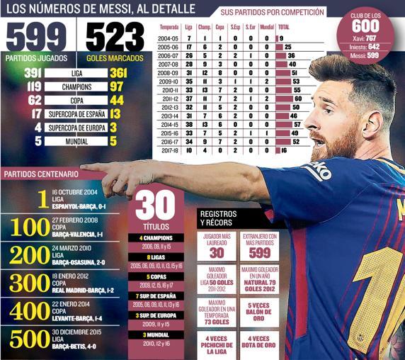 梅西在职业生涯第一次代表巴萨一线队出场是在2004年10月16日,当时他在加泰罗尼亚德比的第86分钟替补德科出场,随后梅西开启了他在巴萨的大时代,不断的豪取冠军,同时也刷新着一个又一个纪录。本周中,梅西代表巴萨出战对阵奥林匹亚科斯的比赛,那是他代表巴萨的第599场比赛。本周末,梅西将迎来巴萨生涯第600场比赛,而在历史上,只有哈维和伊涅斯塔比他的出场次数更多。