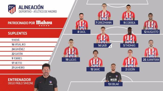 腾讯体育讯 北京时间11月4日晚23时15分,2017-18赛季西甲第11轮,马竞做客挑战拉科鲁尼亚,双方首发阵容已经公布。